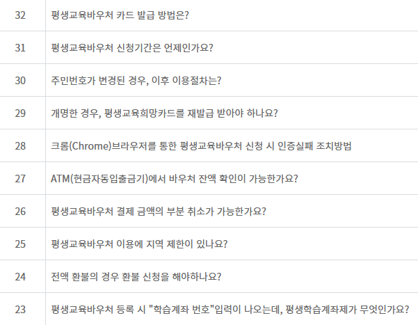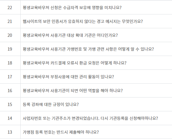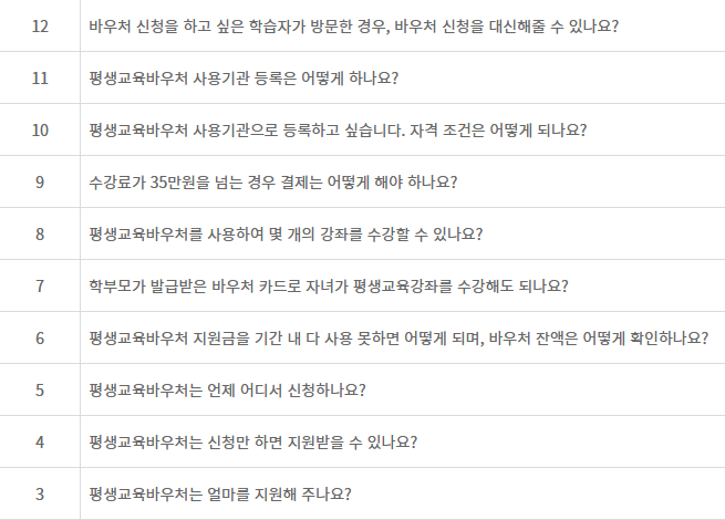 평생교육바우처에 대해 많이 묻는 질문리스트입니다. 궁금한 점이 있다면 확인해보세요